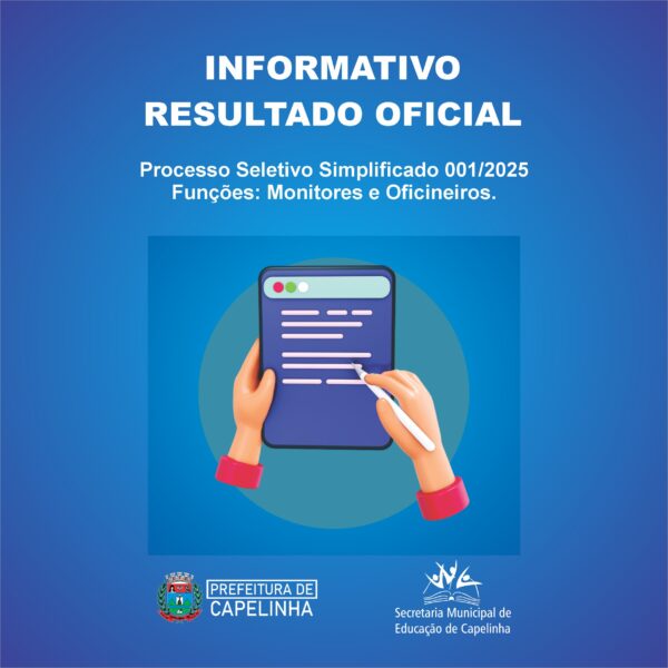 EducaçãoPublicações Informativo – Resultado OficialProcesso Seletivo Simplificado 001/2025Funções: Monitores e Oficineiros. 0 827 Facebook Twitter Google+ Pinterest WhatsApp LEIA MAIS