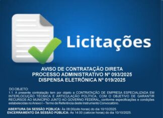 AVISO DE CONTRATAÇÃO DIRETA PROCESSO ADMINISTRATIVO Nº 093/2025DISPENSA ELETRÔNICA Nº 019/2025