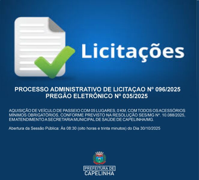 AQUISIÇÃO DE VEÍCULO DE PASSEIO COM 05 LUGARES, 0 KM, COM TODOS OS ACESSÓRIOS MÍNIMOS OBRIGATÓRIOS, CONFORME PREVISTO NA RESOLUÇÃO SES/MG Nº. 10.088/2025, EM ATENDIMENTO A SECRETARIA MUNICIPAL DE SAÚDE DE CAPELINHA/MG.