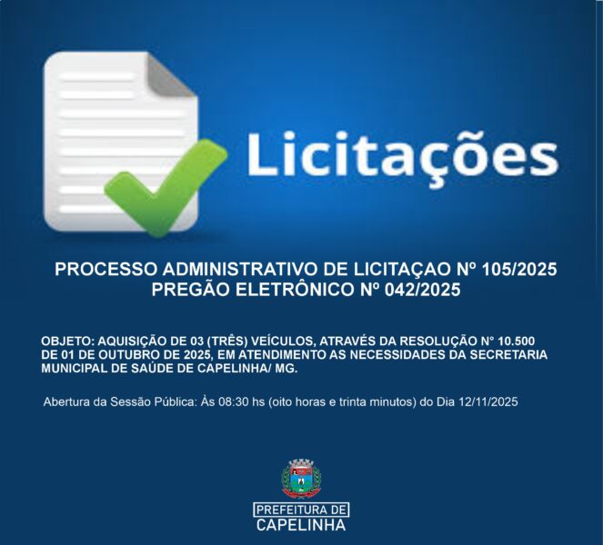 Editais 2025Educação PROCESSO ADMINISTRATIVO DE LICITAÇAO Nº 105/2025PREGÃO ELETRÔNICO Nº 042/2025 0 53 Facebook Twitter Google+ Pinterest WhatsApp AQUISIÇÃO DE 03 (TRÊS) VEÍCULOS, ATRAVÉS DA RESOLUÇÃO N° 10.500 DE 01 DE OUTUBRO DE 2025, EM ATENDIMENTO AS NECESSIDADES DA SECRETARIA MUNICIPAL DE SAÚDE DE CAPELINHA/ MG. LEIA MAIS